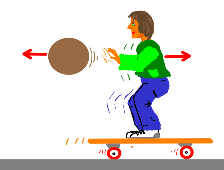 Jemand steht auf einem Skateboard und wirft einen schweren Medizinball nach vorne. Dann bewegen sich der Werfer und sein Skateboard nach hinten.