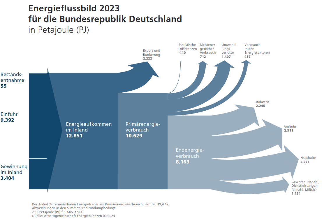 - Berechnen Sie aus der oben stehenden Grafik den durchschnittlichen Primärenergieverbrauch eines deutschen Einwohners pro Person und Tag in kWh.
