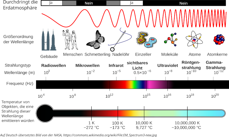 Im folgenden Bild sind die Eigenschaften elektromagnetischer Strahlung verschiedener Wellenlänge bzw. Frequenz einmal zusammengefasst.