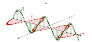 Eine elektromagnetische Welle besteht aus einem wellenförmigen elektrischen und einem wellenförmigen magnetischen Feld, die senkrecht aufeinander stehen. Das elektrische Feld erzeugt das magnetische Feld und das magnetische Feld erzeugt das elektrische Feld und so kann sich diese Welle durch einen absolut leeren Raum bewegen.
