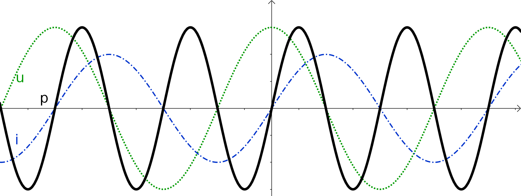 Wie man an den Funktionsgraphen sieht, nimmt die Leistung mit der Zeit nun genau so viel positive Werte, wie negative Funktionswerte an. Das heißt in der Summe leistet so ein Stromkreislauf nichts. So eine Leistung nennt man Blindleistung. Der kapazitive Widerstand ist daher auch ein sogenannter Blindwiderstand.