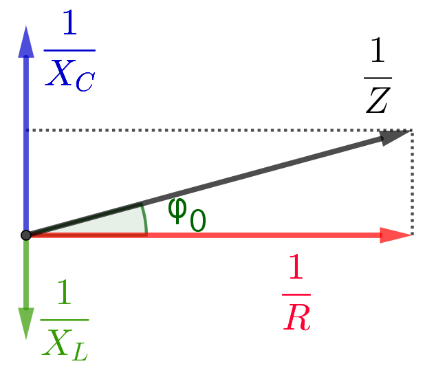 Man kann also bei der Parallelschaltung sagen, dass sich die Leitwerte am Ohm'schen Widerstand, an einer Induktivität (einer Spule) und an einem Kondensator genau so verhalten, wie die Stromstärken, weil die Spannung in der Paralellschaltung ja überall gleich ist. Das führt zu folgendem Zeigerdiagramm für die Leitwerte: