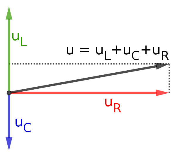 Aber die Spannungen über den ohm'schen, kapazitiven und induktiven Widerständen haben jeweils Phasenverschiebungen. Unten sind die induktive- die kapazitive und die ohm'sche Spannung als Zeiger dargestellt. So sind sowohl die Amplituden der Spannungen, als auch deren Phasenverschiebungen sichtbar. An der Abbildung unten ist zu sehen, dass die Spannung in einer Induktivität der Spannung am ohm'schen Widerstand um