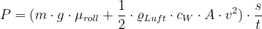 Wer so einen vornehmen Rechner nicht zur Hand hat, kann auch als Näherungslösung den Rollwiderstand weglassen, da der insbesondere bei hohen Geschwindigkeiten viel kleiner ist, als der Luftwiderstand. Dann gilt: